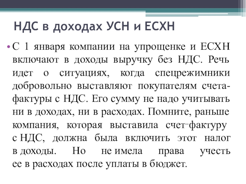 и ЕСХН включают в доходы выручку без НДС. Речь идет о ситуациях, когда спецрежимники добровольно выставляют покупателям счета-фактуры с НДС. Его сумму не надо учитывать ни в доходах, ни в расходах. Помните, раньше компания, которая выставила счет‑фактуру с НДС, должна была включить этот налог в доходы. Но не имела права учесть ее в расходах после уплаты в бюджет.