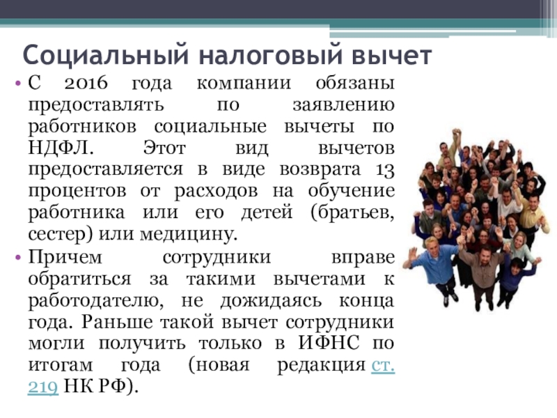 социальные вычеты по НДФЛ. Этот вид вычетов предоставляется в виде возврата 13 процентов от расходов на обучение работника или его детей (братьев, сестер) или медицину.