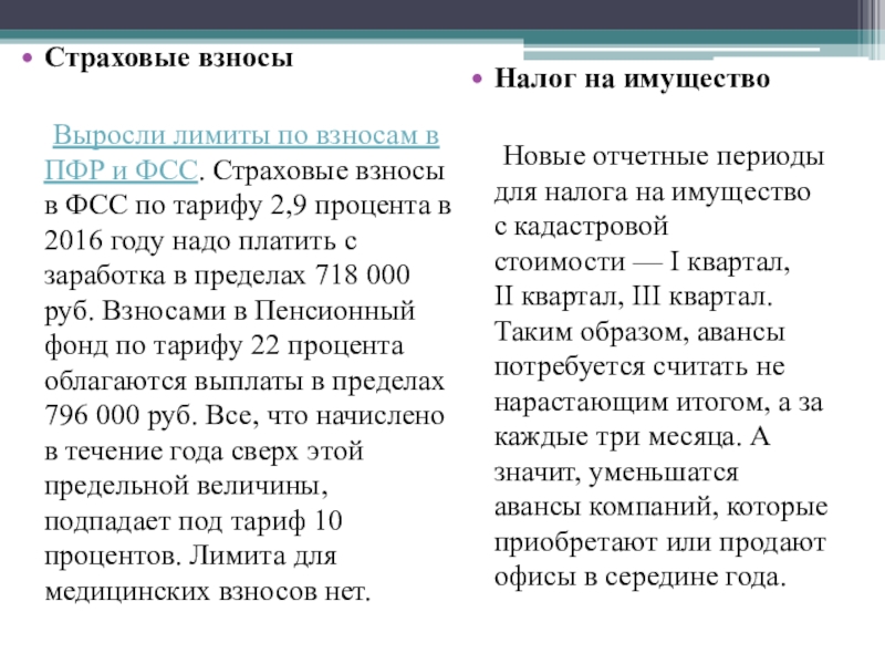 ФСС по тарифу 2,9 процента в 2016 году надо платить с заработка в пределах 718 000 руб. Взносами в Пенсионный фонд по тарифу 22 процента облагаются выплаты в пределах 796 000 руб. Все, что начислено в течение года сверх этой предельной величины, подпадает под тариф 10 процентов. Лимита для медицинских взносов нет.