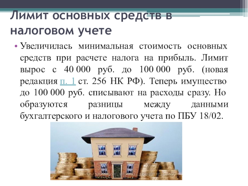 расчете налога на прибыль. Лимит вырос с 40 000 руб. до 100 000 руб. (новая редакция п. 1 ст. 256 НК РФ). Теперь имущество до 100 000 руб. списывают на расходы сразу. Но образуются разницы между данными бухгалтерского и налогового учета по ПБУ 18/02.