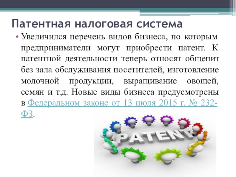 патент. К патентной деятельности теперь относят общепит без зала обслуживания посетителей, изготовление молочной продукции, выращивание овощей, семян и т.д. Новые виды бизнеса предусмотрены в Федеральном законе от 13 июля 2015 г. № 232-ФЗ.