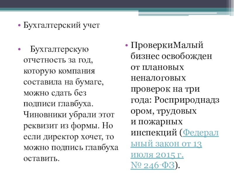 ПроверкиМалый бизнес освобожден от плановых неналоговых проверок на три года: Росприроднадзором, трудовых и пожарных инспекций (Федеральный закон от 13 июля 2015 г. № 246‑ФЗ).