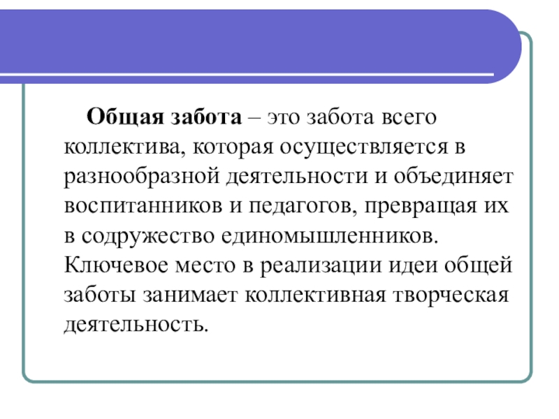 которая осуществляется в разнообразной деятельности и объединяет воспитанников и педагогов, превращая их в содружество единомышленников. Ключевое место в реализации идеи общей заботы занимает коллективная творческая деятельность.