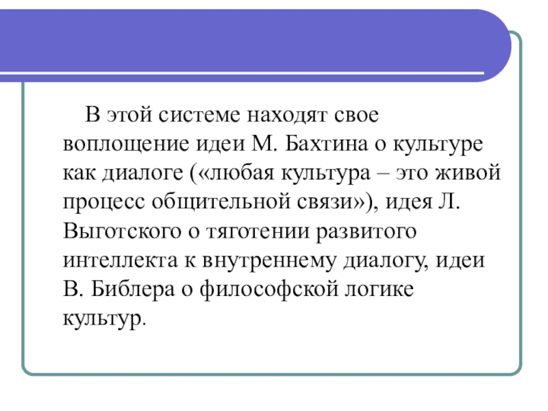 М. Бахтина о культуре как диалоге («любая культура – это живой процесс общительной связи»), идея Л. Выготского о тяготении развитого интеллекта к внутреннему диалогу, идеи В. Библера о философской логике культур.