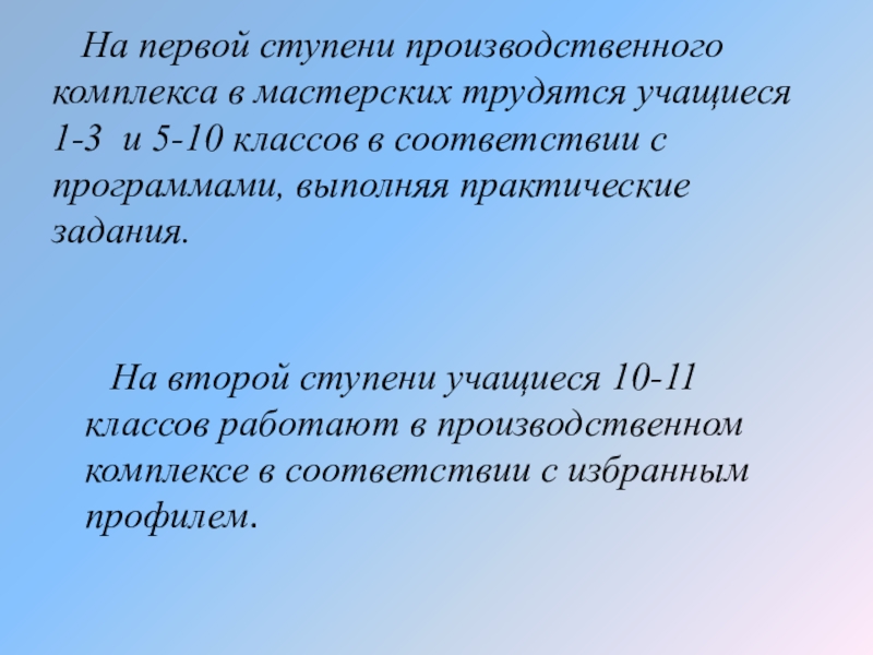 На второй ступени учащиеся 10-11 классов работают в производственном комплексе в соответствии с избранным профилем.