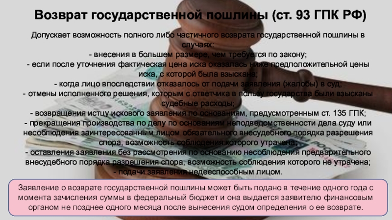 Заявление о возврате государственной пошлины может быть подано в течение одного года с момента зачисления суммы в федеральный бюджет и она выдается заявителю финансовым органом не позднее одного месяца после вынесения судом определения о ее возврате.