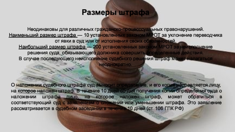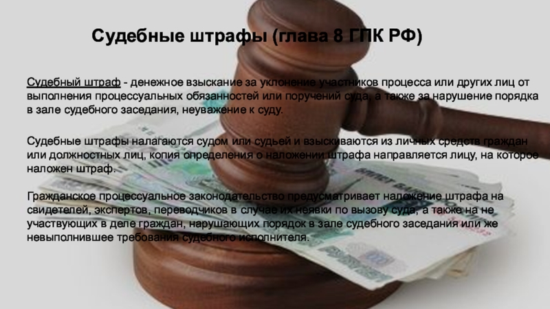 Гражданское процессуальное законодательство предусматривает наложение штрафа на свидетелей, экспертов, переводчиков в случае их неявки по вызову суда, а также на не участвующих в деле граждан, нарушающих порядок в зале судебного заседания или же невыполнившее требования судебного исполнителя.