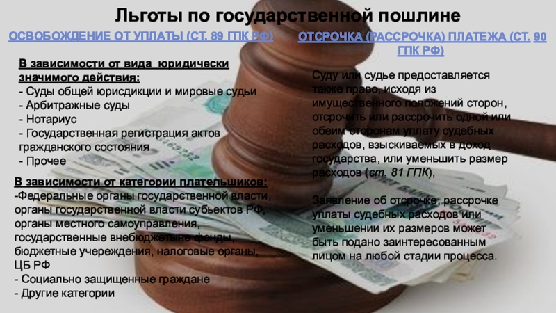 Суду или судье предоставляется также право, исходя из имущественного положений сторон, отсрочить или рассрочить одной или обеим сторонам уплату судебных расходов, взыскиваемых в доход государства, или уменьшить размер расходов (ст. 81 ГПК),