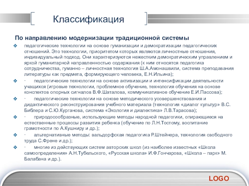 демократизации педагогических отношений. Это технологии, приоритетом которых являются личностные отношения, индивидуальный подход. Они характеризуются нежестким демократическим управлением и яркой гуманитарной направленностью содержания (к ним относятся педагогика сотрудничества, гуманно – личностная технология Ш.А.Амонашвили, система преподавания литературы как предмета, формирующего человека, Е.Н.Ильина);