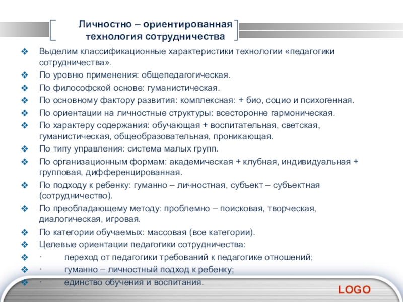Выделим классификационные характеристики технологии «педагогики сотрудничества».