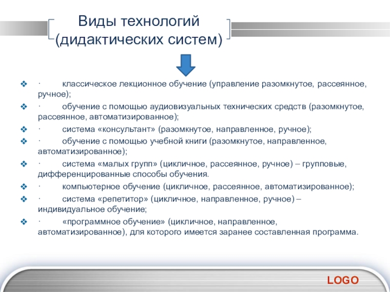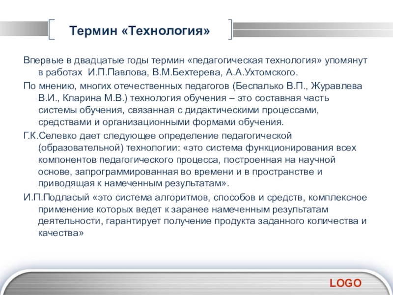 И.П.Подласый «это система алгоритмов, способов и средств, комплексное применение которых ведет к заранее намеченным результатам деятельности, гарантирует получение продукта заданного количества и качества»