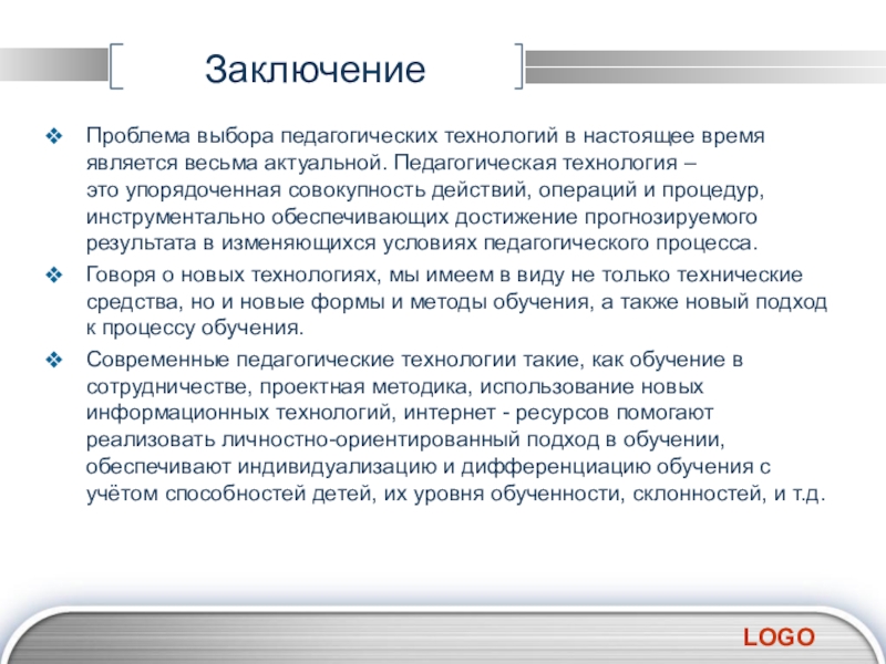 Современные педагогические технологии такие, как обучение в сотрудничестве, проектная методика, использование новых информационных технологий, интернет - ресурсов помогают реализовать личностно-ориентированный подход в обучении, обеспечивают индивидуализацию и дифференциацию обучения с учётом способностей детей, их уровня обученности, склонностей, и т.д.