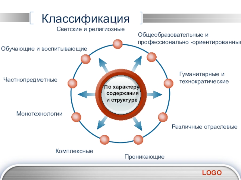По характеру содержания: обучающая + воспитательная, светская, гуманистическая, общеобразовательная, проникающая.