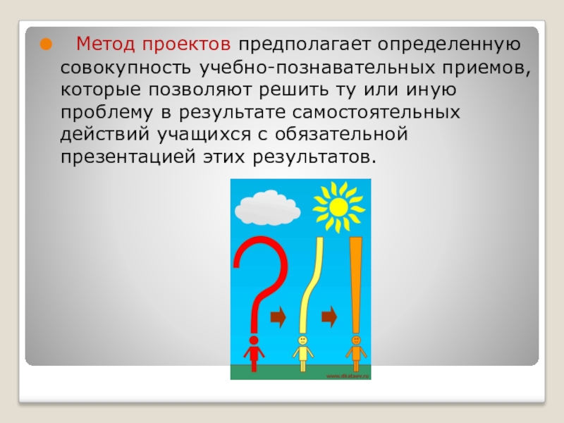 Слайд 4 Метод проектов предполагает определенную совокупность учебно-познавательных приемов, которые позволяют решить