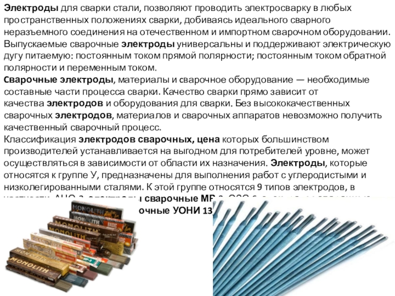 Слайд 13Электроды для сварки стали, позволяют проводить электросварку в любых пространственных положениях сварки,