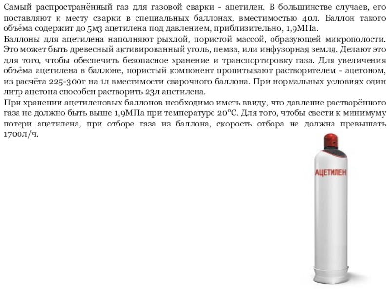 Слайд 19Самый распространённый газ для газовой сварки - ацетилен. В большинстве случаев,