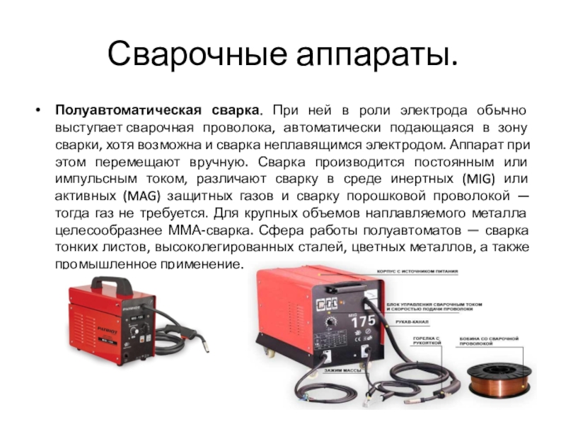автоматически подающаяся в зону сварки, хотя возможна и сварка неплавящимся электродом. Аппарат при этом перемещают вручную. Сварка производится постоянным или импульсным током, различают сварку в среде инертных (MIG) или активных (MAG) защитных газов и сварку порошковой проволокой — тогда газ не требуется. Для крупных объемов наплавляемого металла целесообразнее ММА-сварка. Сфера работы полуавтоматов — сварка тонких листов, высоколегированных сталей, цветных металлов, а также промышленное применение.