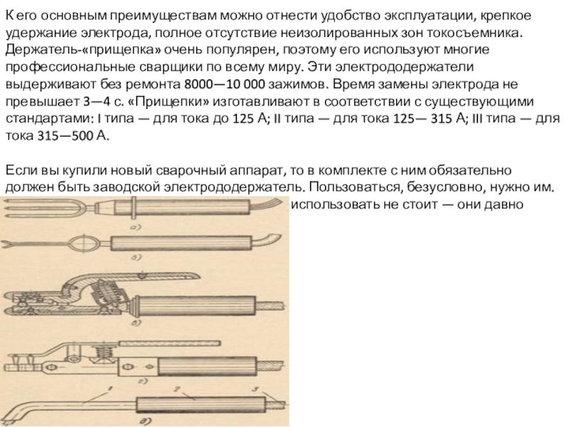 полное отсутствие неизолированных зон токосъемника. Держатель-«прищепка» очень популярен, поэтому его используют многие профессиональные сварщики по всему миру. Эти электрододержатели выдерживают без ремонта 8000—10 000 зажимов. Время замены электрода не превышает 3—4 с. «Прищепки» изготавливают в соответствии с существующими стандартами: I типа — для тока до 125 А; II типа — для тока 125— 315 А; III типа — для тока 315—500 А.