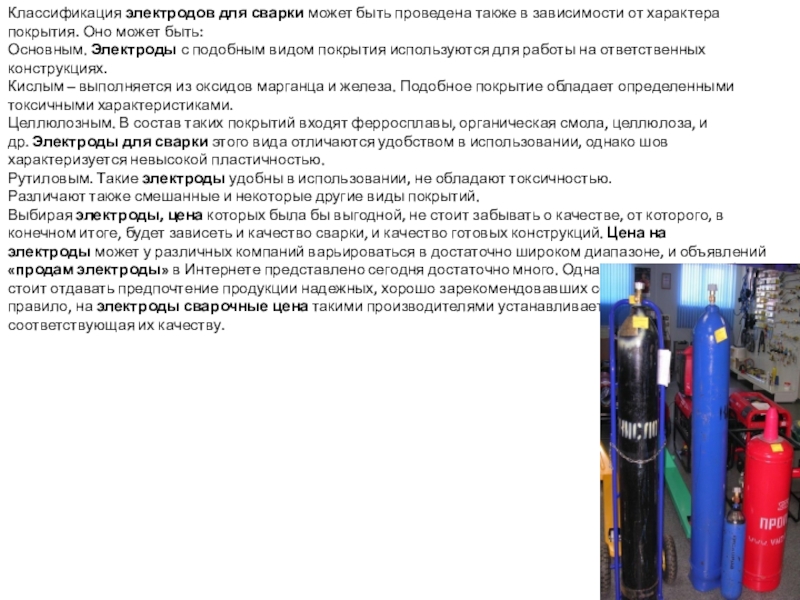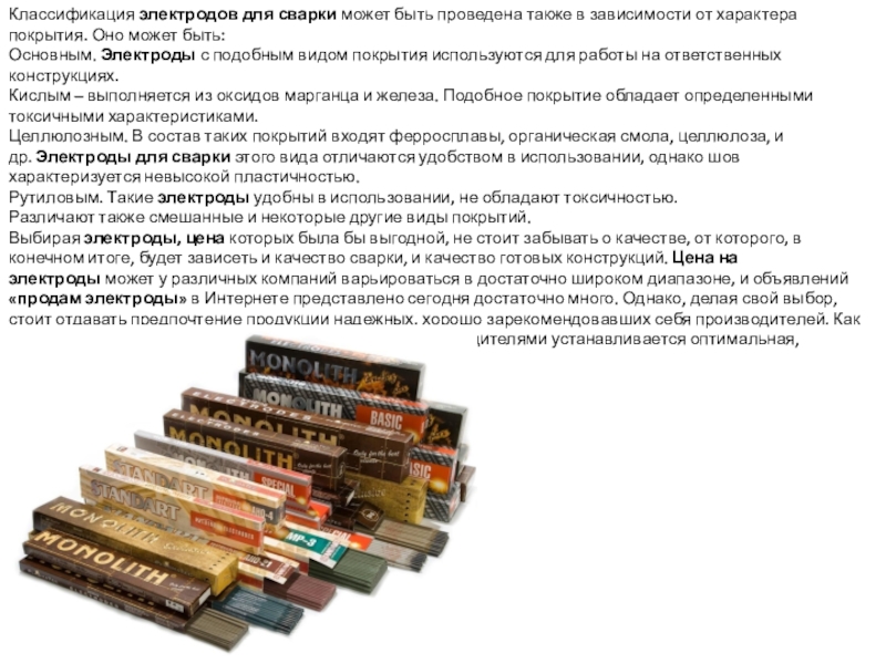 Слайд 17Классификация электродов для сварки может быть проведена также в зависимости от характера покрытия.