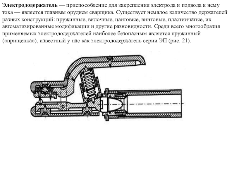 является главным орудием сварщика. Существует немалое количество держателей разных конструкций: пружинные, вилочные, цанговые, винтовые, пластинчатые, их автоматизированные модификации и другие разновидности. Среди всего многообразия применяемых электрододержателей наиболее безопасным является пружинный («прищепка»), известный у нас как электрододержатель серии ЭП (рис. 21).