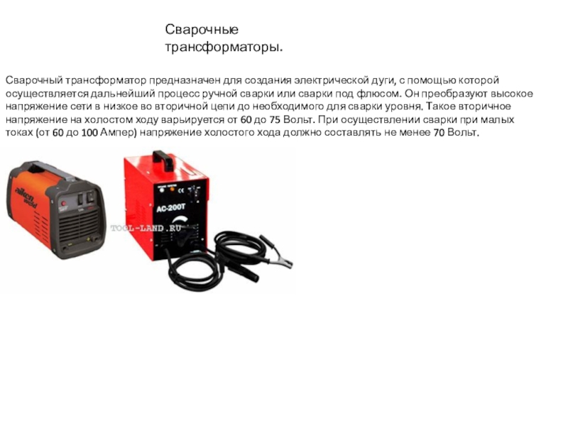 осуществляется дальнейший процесс ручной сварки или сварки под флюсом. Он преобразуют высокое напряжение сети в низкое во вторичной цепи до необходимого для сварки уровня. Такое вторичное напряжение на холостом ходу варьируется от 60 до 75 Вольт. При осуществлении сварки при малых токах (от 60 до 100 Ампер) напряжение холостого хода должно составлять не менее 70 Вольт.