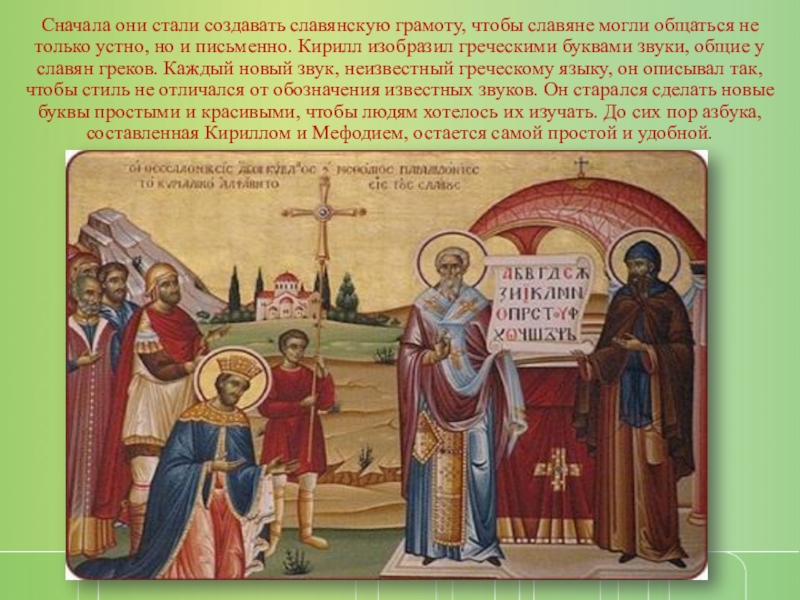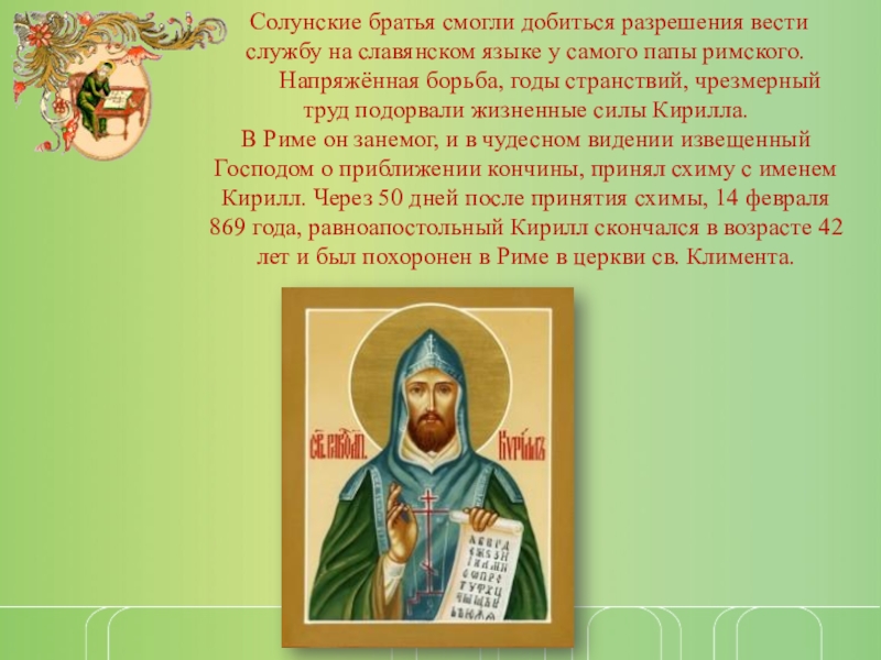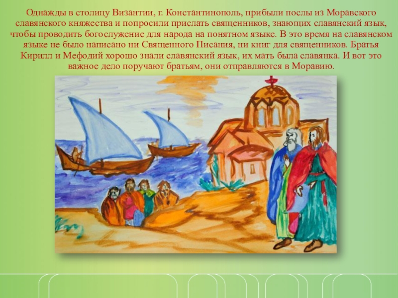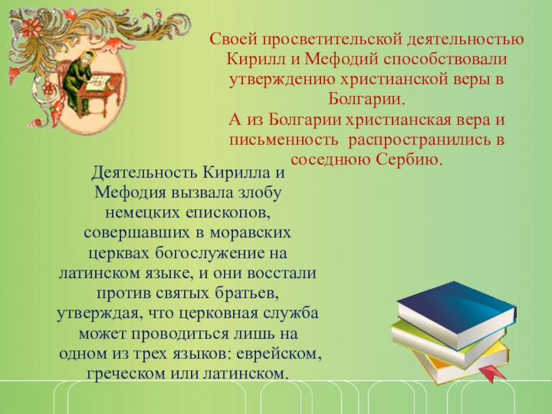Деятельность Кирилла и Мефодия вызвала злобу немецких епископов, совершавших в моравских церквах богослужение на латинском языке, и они восстали против святых братьев, утверждая, что церковная служба может проводиться лишь на одном из трех языков: еврейском, греческом или латинском.