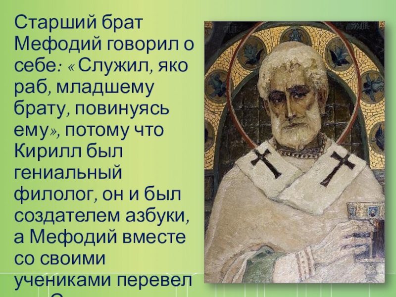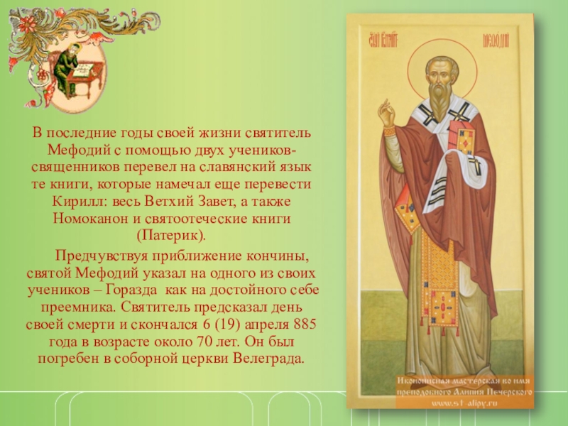 После кончины Кирилла Мефодий стойко переносил нападки латинской церкви: по наговору латинских епископов его на два с половиной года заточили в тюрьму, в лютый мороз возили волоком по снегу. Но просветитель не отрекся от служения славянам.