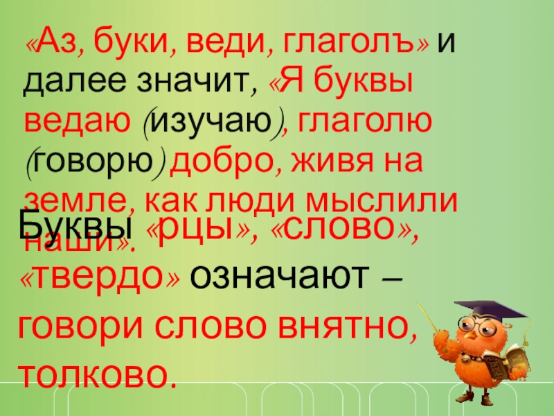 Буквы «рцы», «слово», «твердо» означают – говори слово внятно, толково.