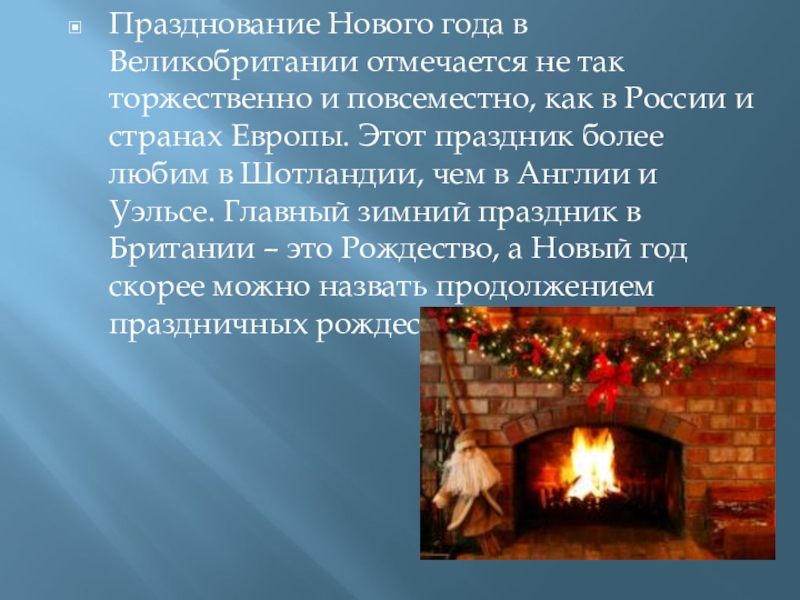 Слайд 13Празднование Нового года в Великобритании отмечается не так торжественно и повсеместно,