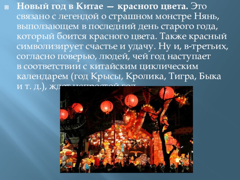 Слайд 11Новый год в Китае — красного цвета. Это связано с легендой о страшном монстре Нянь, выползающем