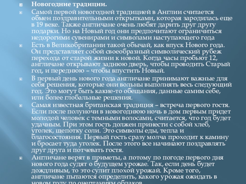 как в России и странах Европы. Этот праздник более любим в Шотландии, чем в Англии и Уэльсе. Главный зимний праздник в Британии – это Рождество, а Новый год скорее можно назвать продолжением праздничных рождественских дней.