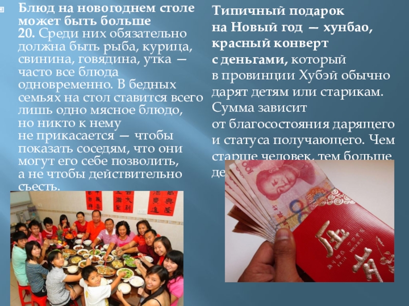 Типичный подарок на Новый год — хунбао, красный конверт с деньгами, который в провинции Хубэй обычно дарят детям или старикам. Сумма зависит от благосостояния дарящего и статуса получающего. Чем старше человек, тем больше денег принято дарить.