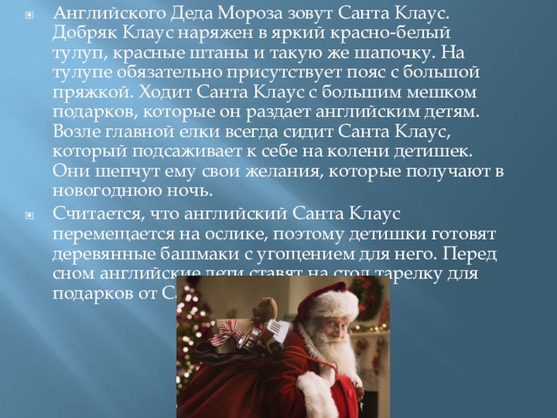 Слайд 14Английского Деда Мороза зовут Санта Клаус. Добряк Клаус наряжен в яркий