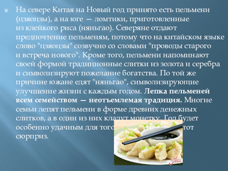 Слайд 9На севере Китая на Новый год принято есть пельмени (цзяоцзы), а на юге —