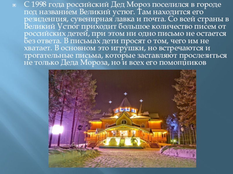 устюг. Там находится его резиденция, сувенирная лавка и почта. Со всей страны в Великий Устюг приходит большое количество писем от российских детей, при этом ни одно письмо не остается без ответа. В письмах дети просят о том, чего им не хватает. В основном это игрушки, но встречаются и трогательные письма, которые заставляют прослезиться не только Деда Мороза, но и всех его помощников