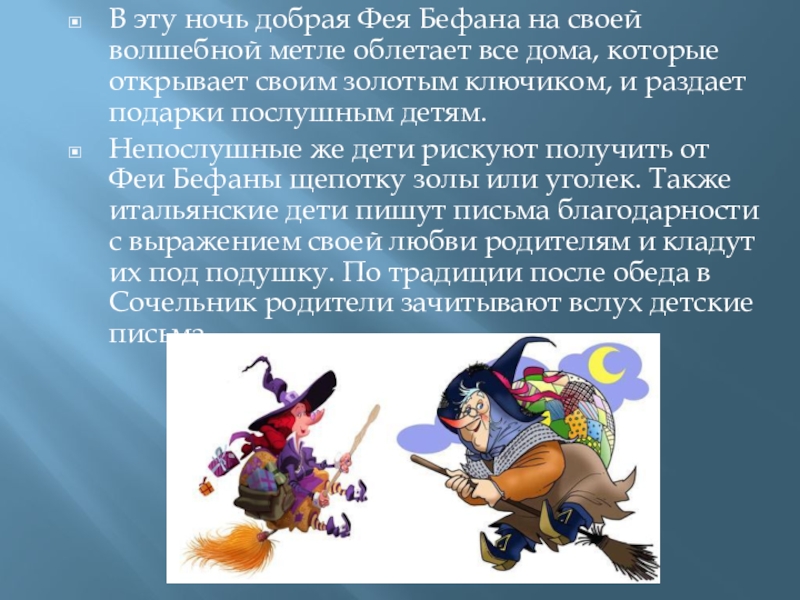 Слайд 24В эту ночь добрая Фея Бефана на своей волшебной метле облетает