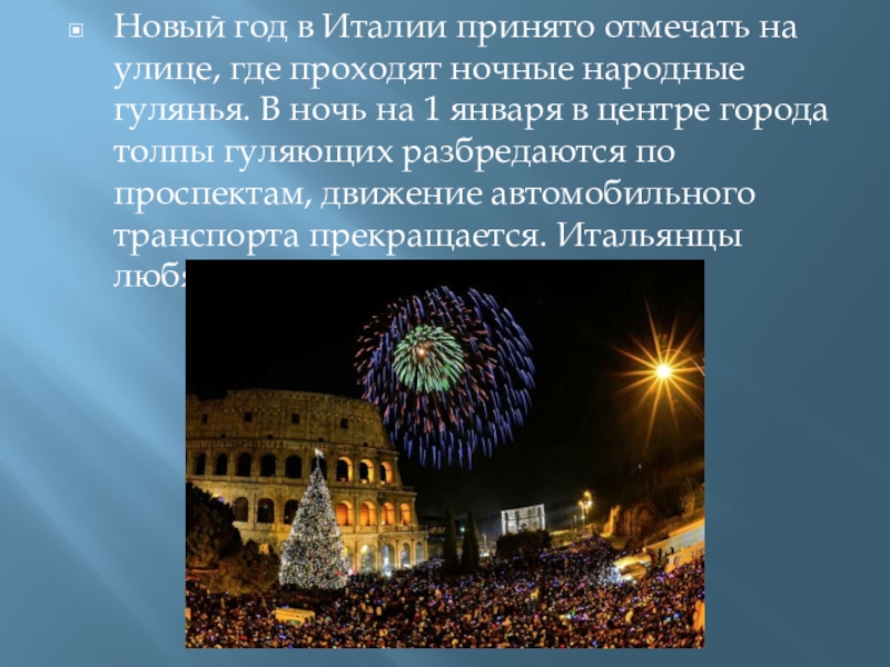 Слайд 22Новый год в Италии принято отмечать на улице, где проходят ночные