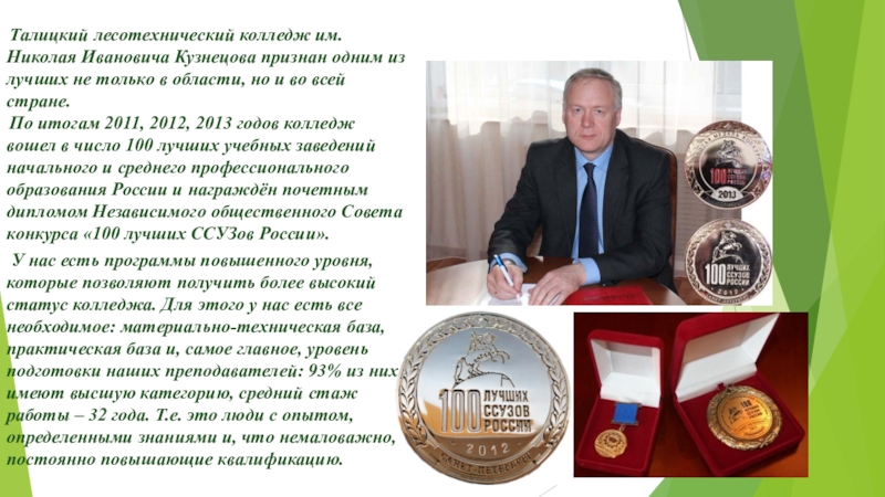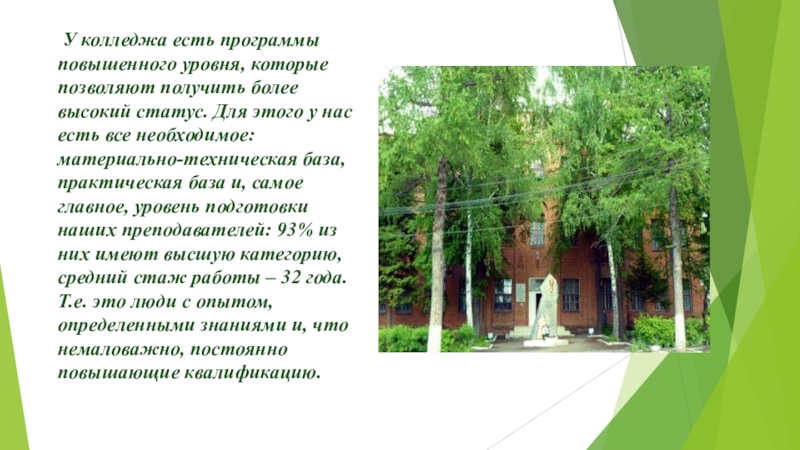 У нас есть программы повышенного уровня, которые позволяют получить более высокий статус колледжа. Для этого у нас есть все необходимое: материально-техническая база, практическая база и, самое главное, уровень подготовки наших преподавателей: 93% из них имеют высшую категорию, средний стаж работы – 32 года. Т.е. это люди с опытом, определенными знаниями и, что немаловажно, постоянно повышающие квалификацию.