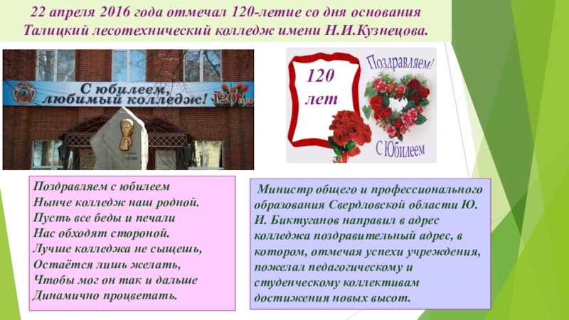22 апреля 2016 года отмечал 120-летие со дня основания Талицкий лесотехнический колледж имени Н.И.Кузнецова.