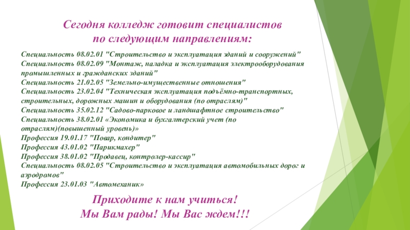 Сегодня колледж готовит специалистов по следующим направлениям: