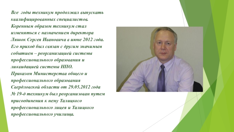 Министр общего и профессионального образования Свердловской области Ю.И. Биктуганов направил в адрес колледжа поздравительный адрес, в котором, отмечая успехи учреждения, пожелал педагогическому и студенческому коллективам достижения новых высот.