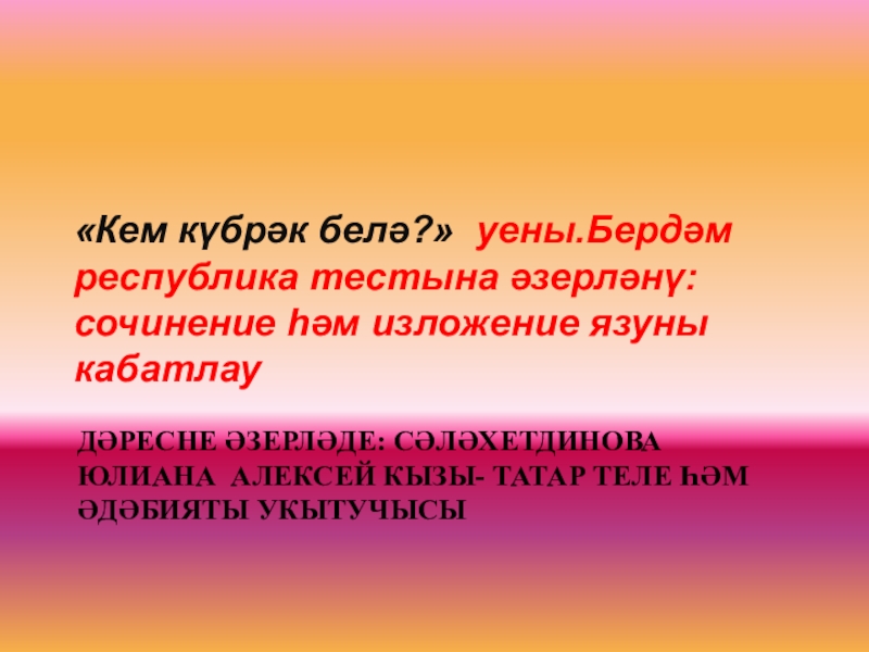 Слайд 1«Кем күбрәк белә?» уены.Бердәм республика тестына әзерләнү: сочинение һәм изложение язуны
