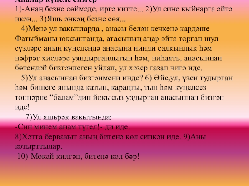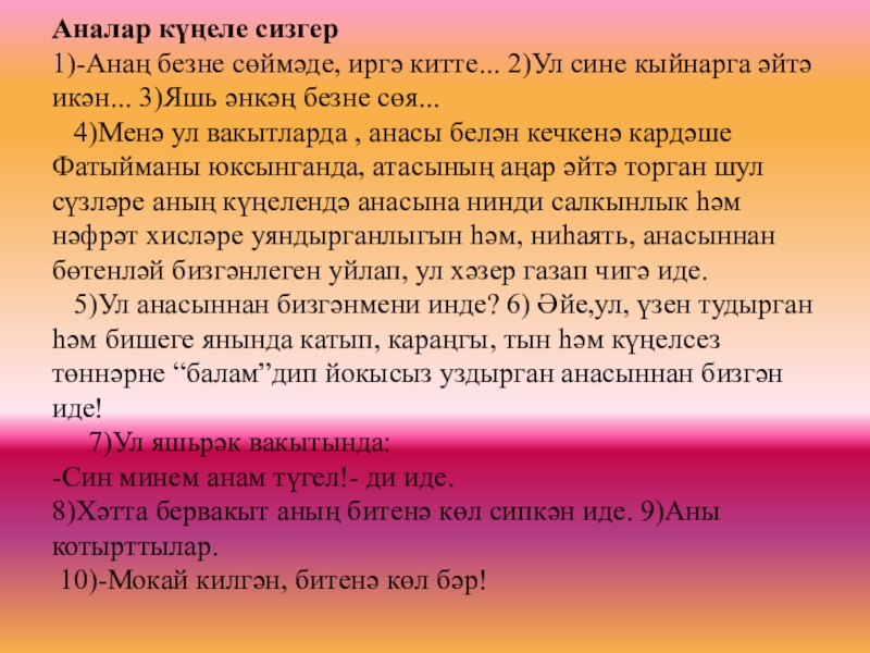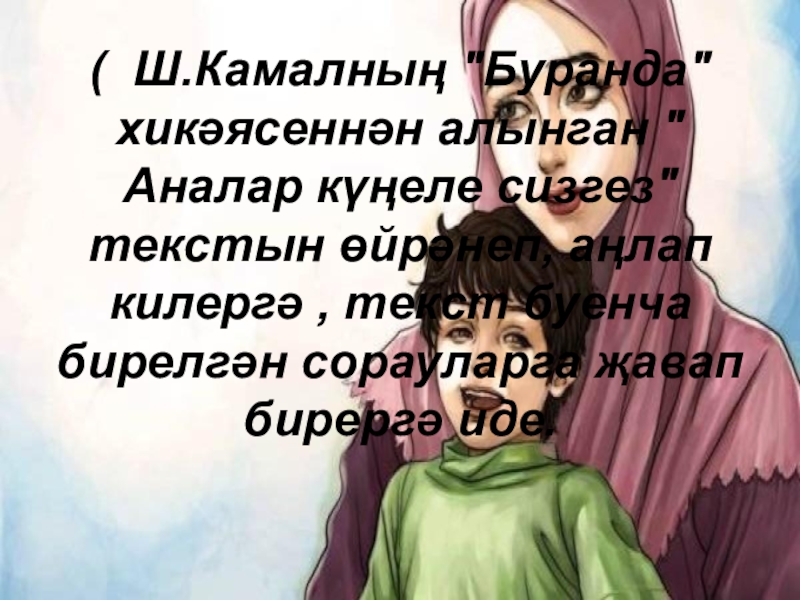 Слайд 9( Ш.Камалның "Буранда" хикәясеннән алынган " Аналар күңеле сизгез" текстын өйрәнеп,