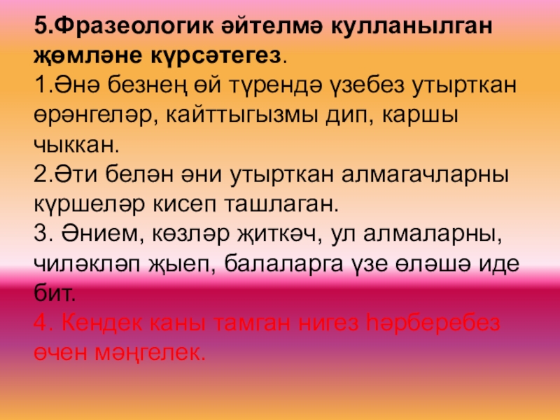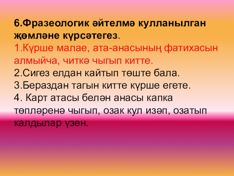 Слайд 725.Фразеологик әйтелмә кулланылган җөмләне күрсәтегез.