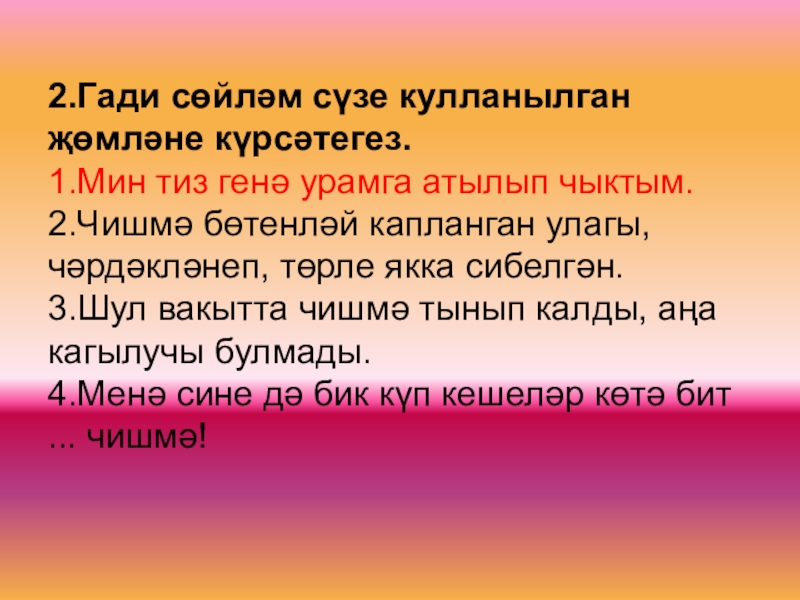 Слайд 692.Гади сөйләм сүзе кулланылган җөмләне күрсәтегез.