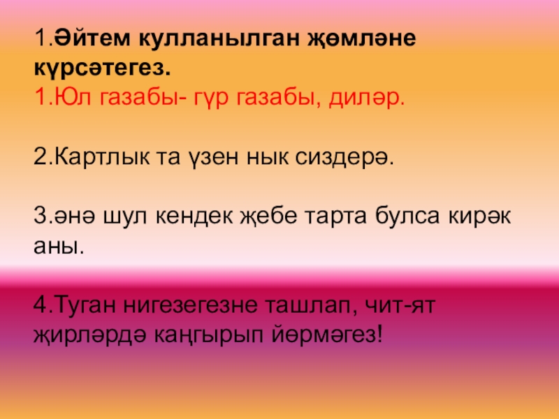 Слайд 681.Әйтем кулланылган җөмләне күрсәтегез.