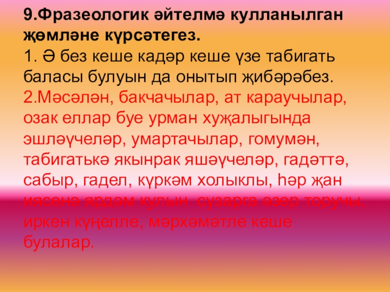 Слайд 769.Фразеологик әйтелмә кулланылган җөмләне күрсәтегез.