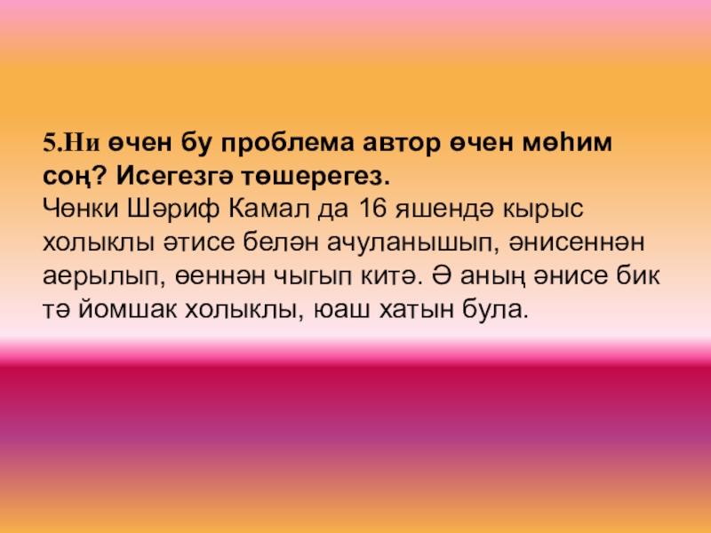 Слайд 355.Ни өчен бу проблема автор өчен мөһим соң? Исегезгә төшерегез.