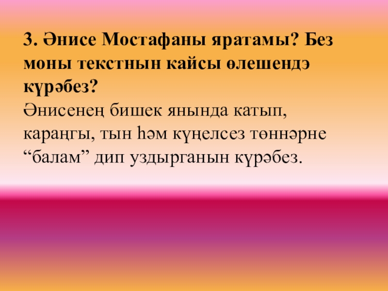 Слайд 263. Әнисе Мостафаны яратамы? Без моны текстнын кайсы өлешендэ күрәбез?