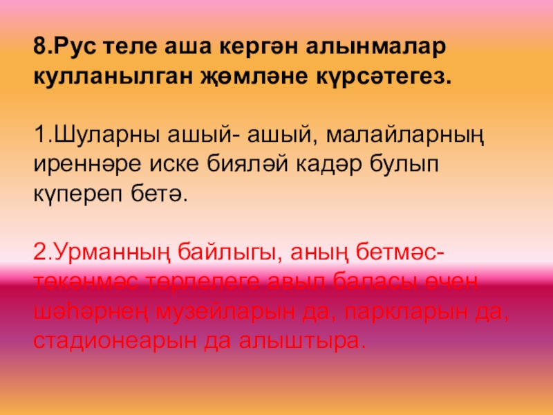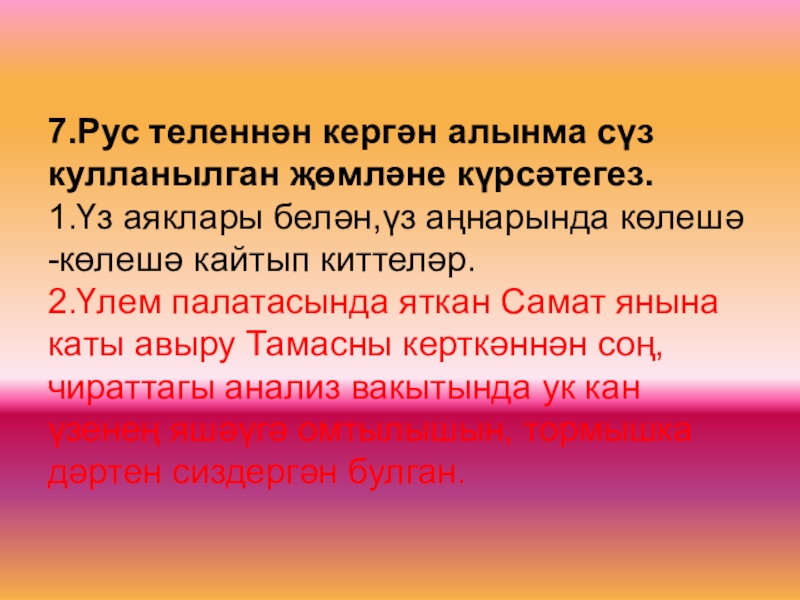 Слайд 747.Рус теленнән кергән алынма сүз кулланылган җөмләне күрсәтегез.